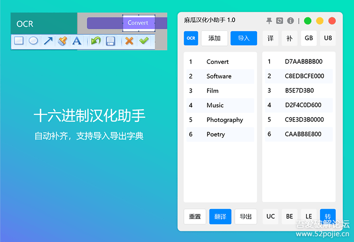 这两天了解学习汉化,遇到需要 16进制 编辑的地方,编码的选择和替换有点麻烦,小白不知道有什么方便的解决办法。所以写了这么一个小工具,来简化操作流程。这样搜索到字符串对应编码的16进制后直接粘贴替换就好了。如果有更好的方法或者建议,欢迎各位大佬们莅临指导