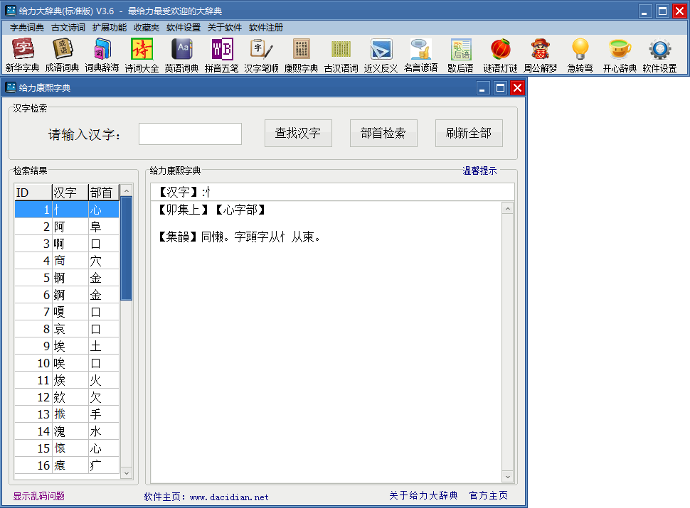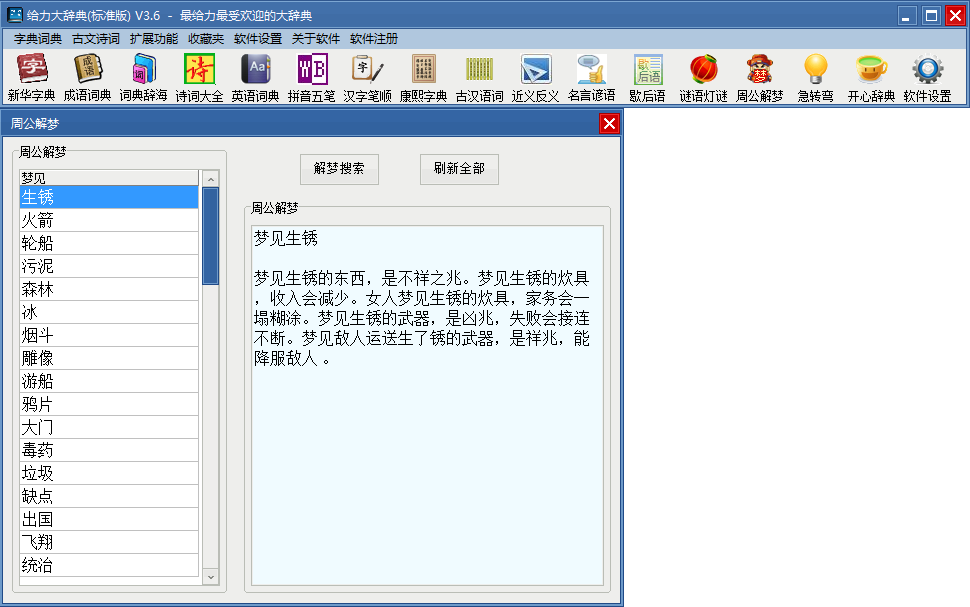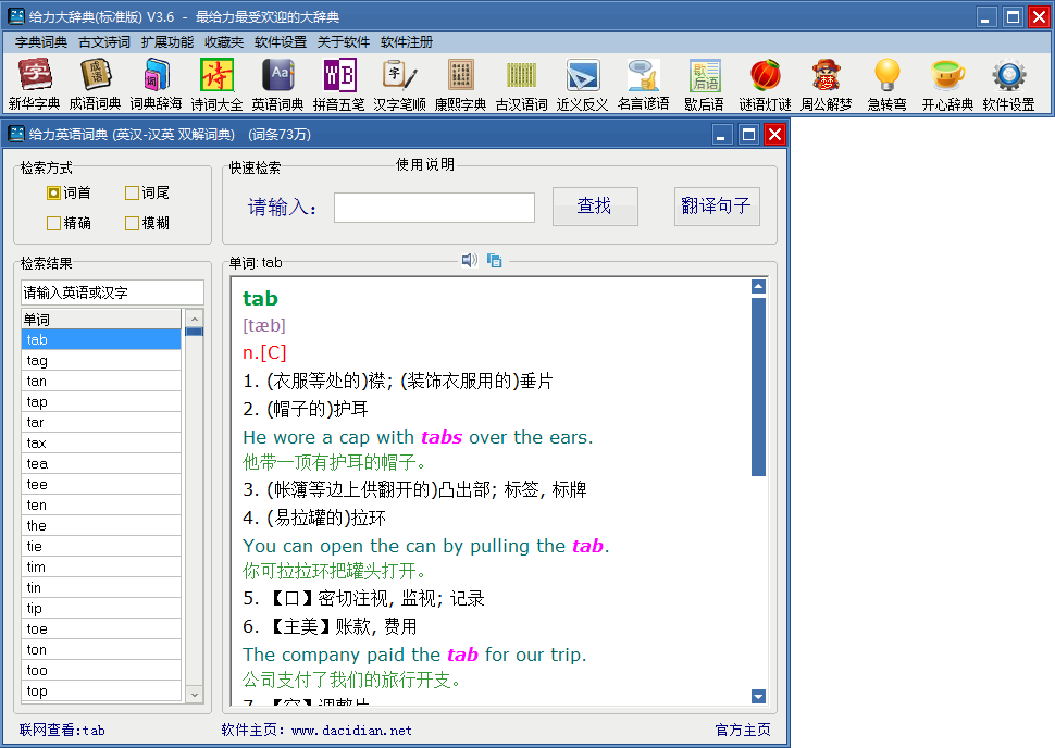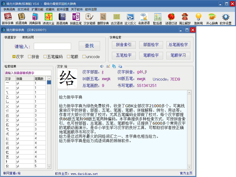 给力大辞典一部辞典包含18部字典词典,总超过9000万字。数据量大,内容丰富,检索方便快捷。一次性下载,18部词典终身免费使用。