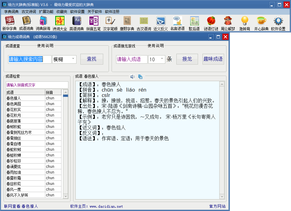 成语词典收录成语56620条,成语中包含有拼音、解释、出处、示例、近义词、反义词、语法 、歇后语、成语故事等内容。可进行成语接龙,成语填空等游戏。
