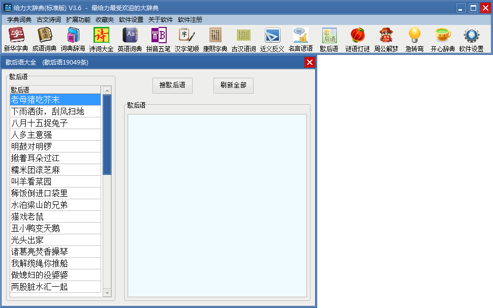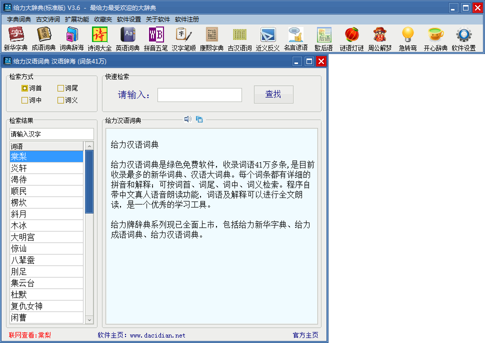 汉语词典收录词条41万多条。每个词条都有详细的拼音和解释;可按词首、词尾、词中、词义检索。