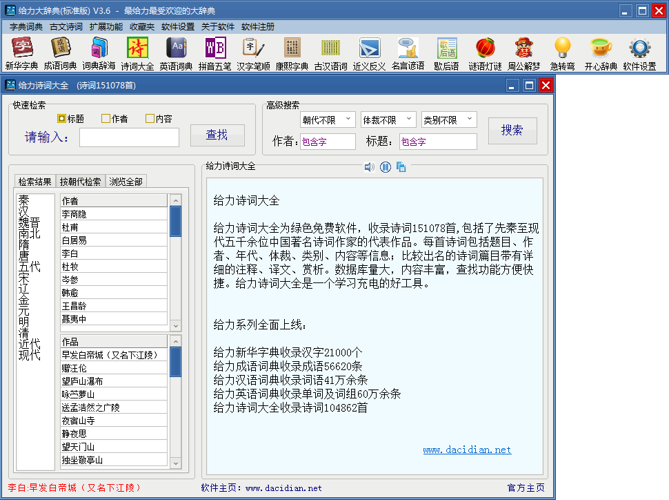 诗词大全收录诗词151078首,每首诗词包括题目、作者、年代、体裁、类别、内容等信息;比较出名的诗词篇目带有详细的注释、译文、赏析等信息。