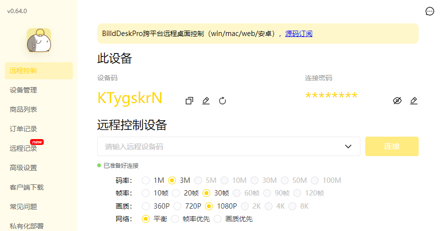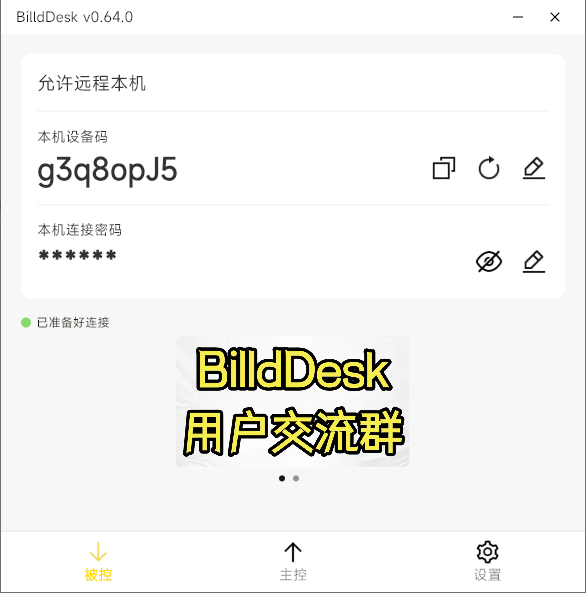 获取设备码和密码:在需要被远程控制的设备上打开 BilldDesk 软件,软件会生成对应的设备码和密码并记录下来。