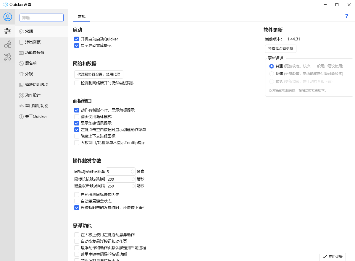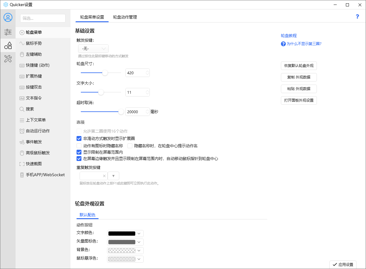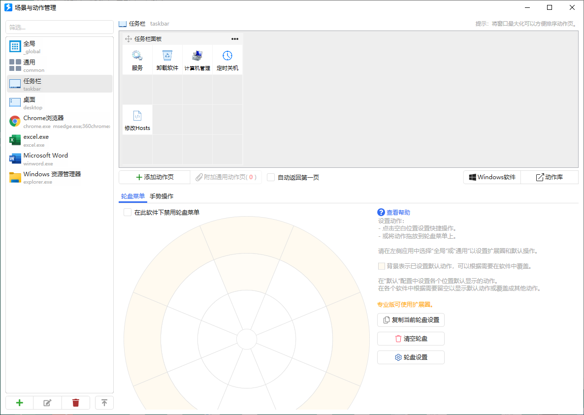 快捷面板:动作触发,基础操作界面。常用操作,就在手边。单击鼠标中键(可设置)即可弹出。位置跟随鼠标,移动很短距离即可触发动作。28个可视化动作按钮,远超超级多键鼠标。